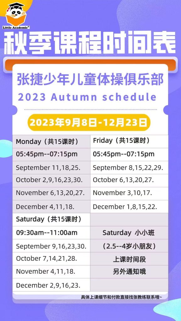 Our current Gymnastic Program holds teaching lessons and practice sessions on Monday, Friday and Saturday every week. Featuring Ms. Jie Zhang as the Gymnastic teacher, who has 22 years of experience in teaching kids gymnastics.